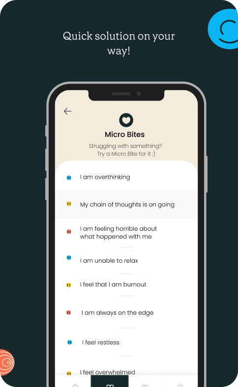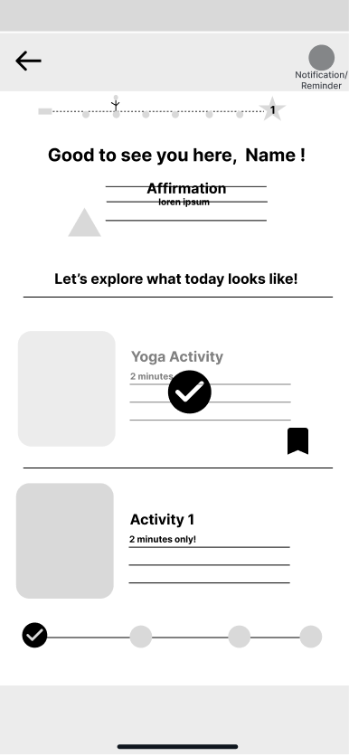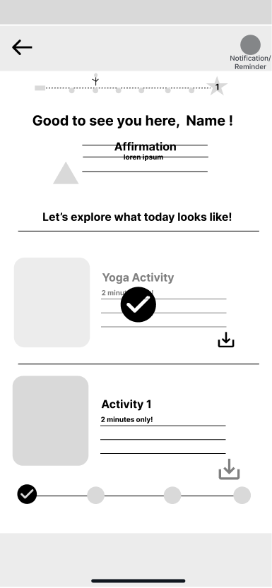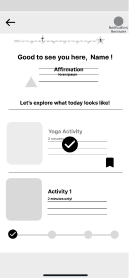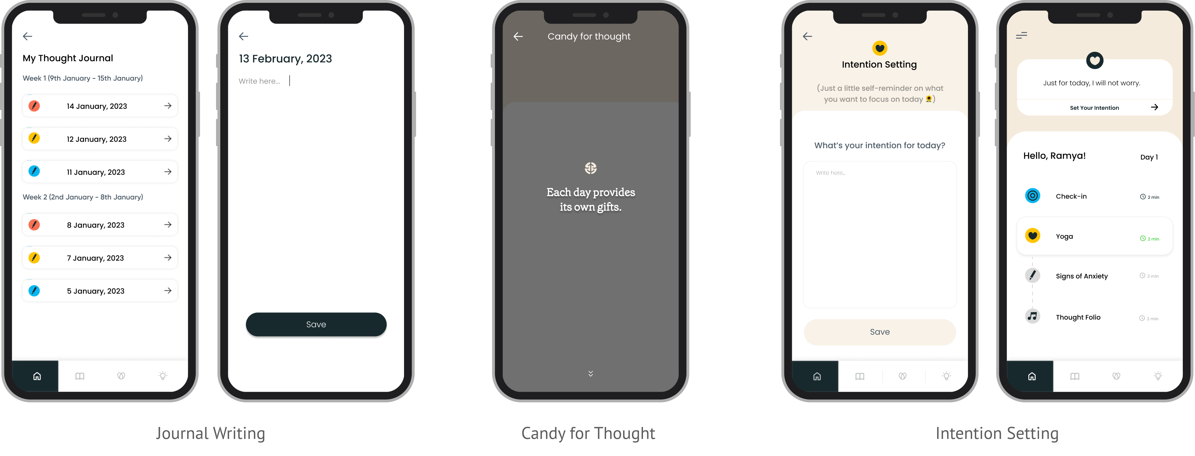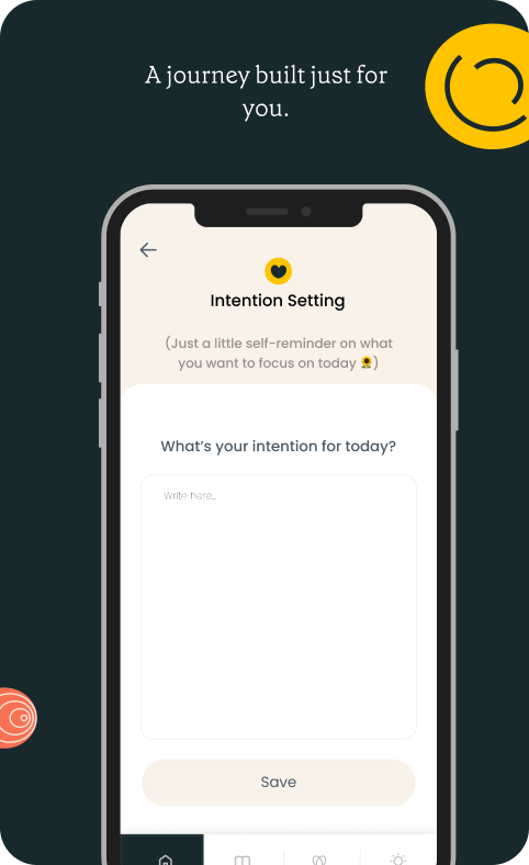 Intention setting- The first activity users saw on the home screen was setting their intention on something meaningful every day. This was displayed at the top of their home screen. Later, we observed that setting even small intentions helped users cultivate direction and control over their lives and manage the anxiety and uncertainties of an open-ended day.