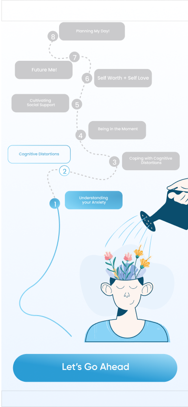 For the next phase, we plan to implement more therapeutic modules for other conditions such as post partum depression, post operative care and bipolar mood disorder. Additionally, we plan to add more features such as users will be able to add and track custom goals. We will also add text-to-speech option in our modules to make it more accessible.