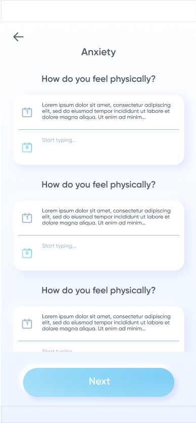 I narrowed down on potential ideas and created mid-fidelity prototype. The usability testing was conducted with 8 users, recruited by snowball technique. For the study, I used the user flow for Anxiety condition. I made sure to be inclusive and had a user with ADHD as well as 2 users with physical disability. Users were shared the application prototype and were given some prompts. Later, we sent a system usability scale for rating.