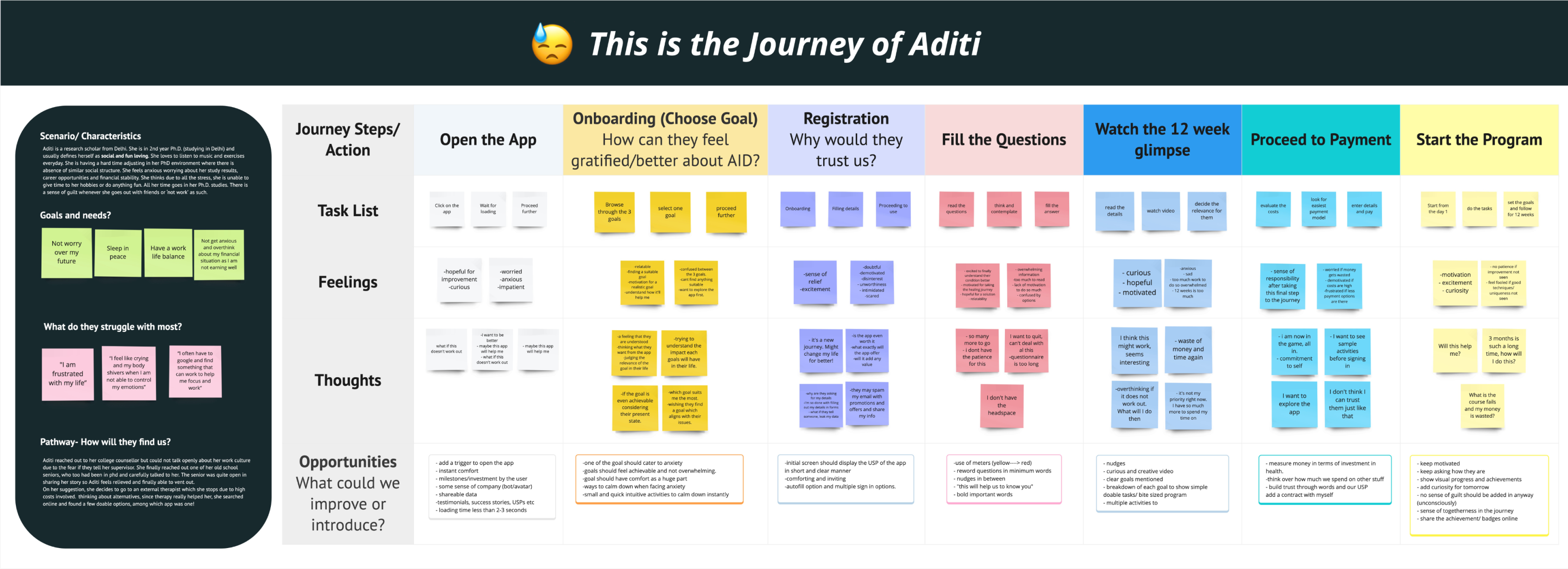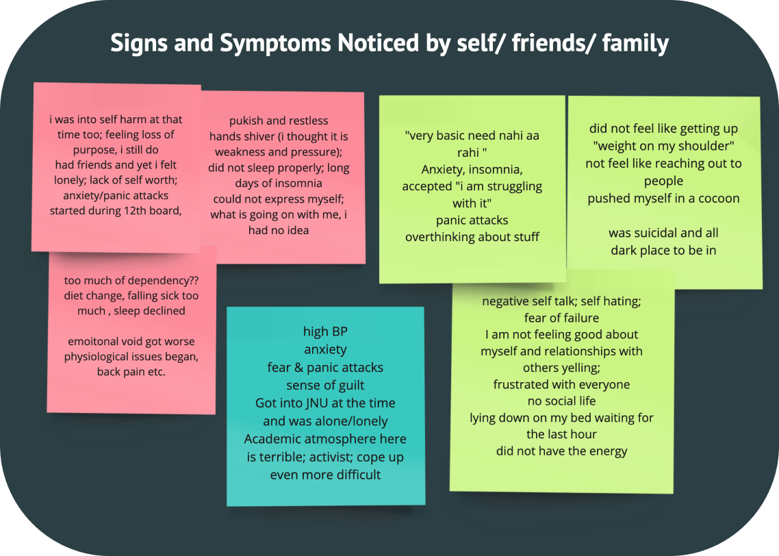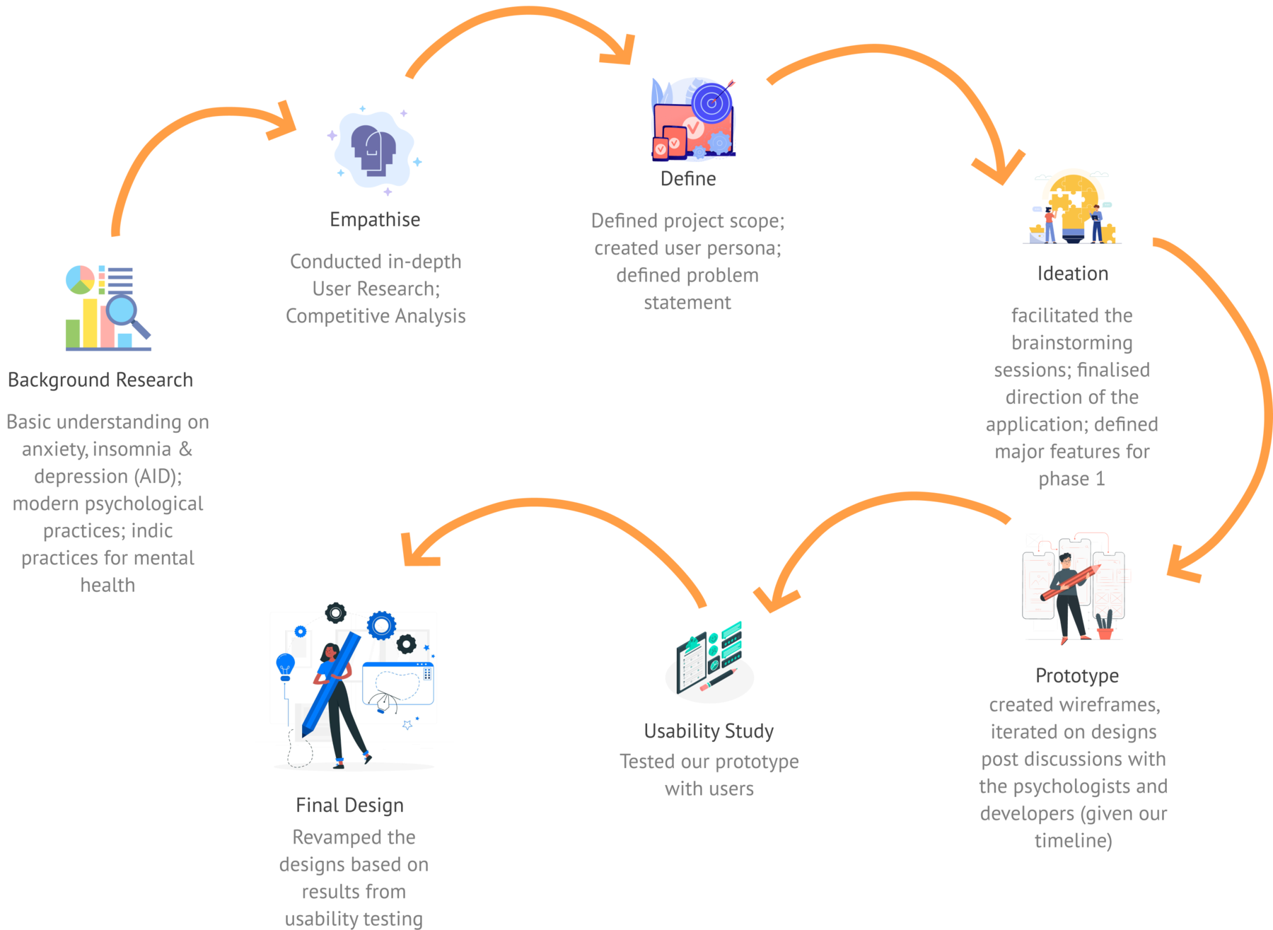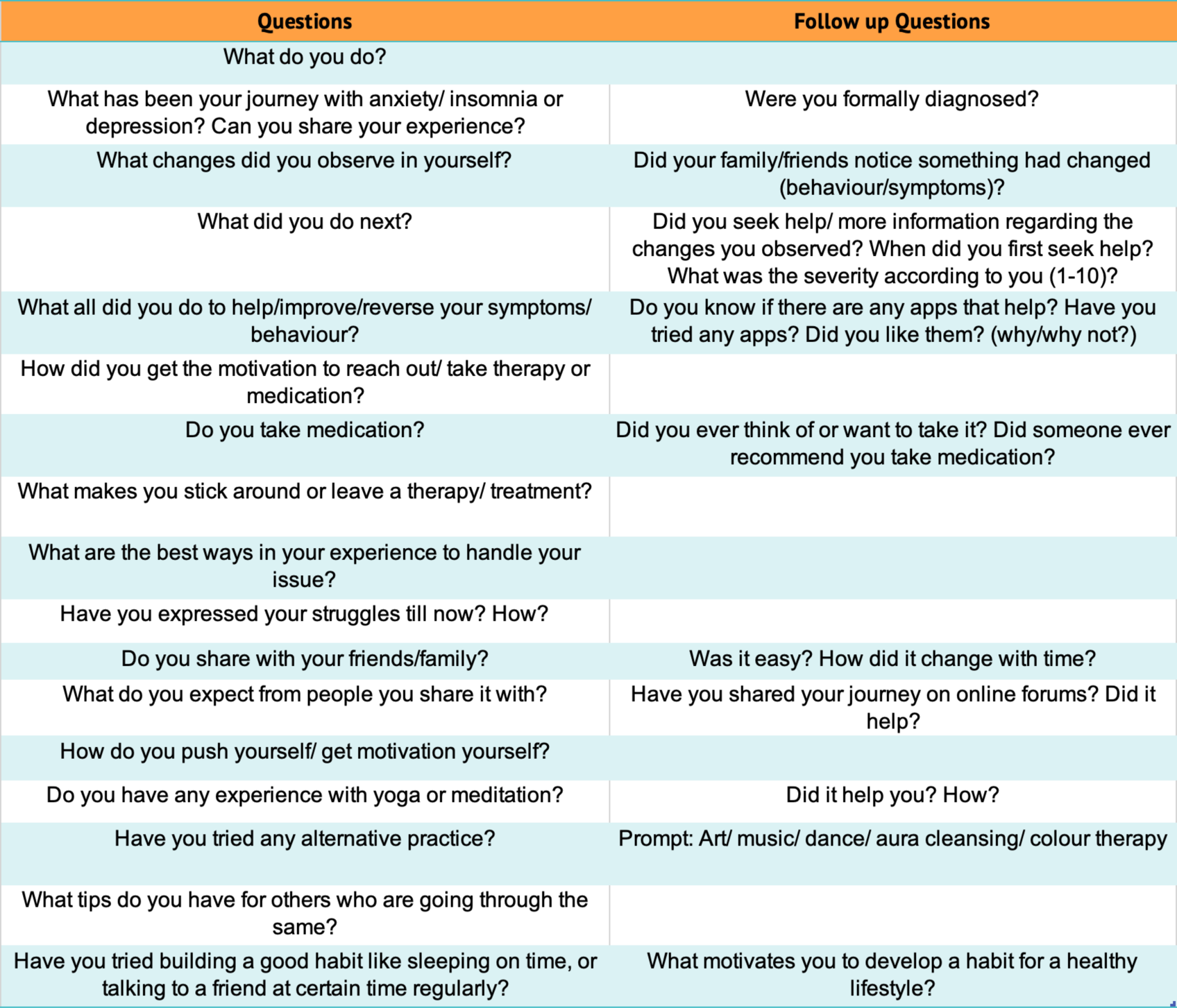 Additionally, interviews with 5 psychologists and 2 yoga practitioners helped us understand the general approach adopted by practitioners in the field to deal with AID. This entire process, therefore, gave us better insights to curate the best optimised digital solutions for varying mental health needs.