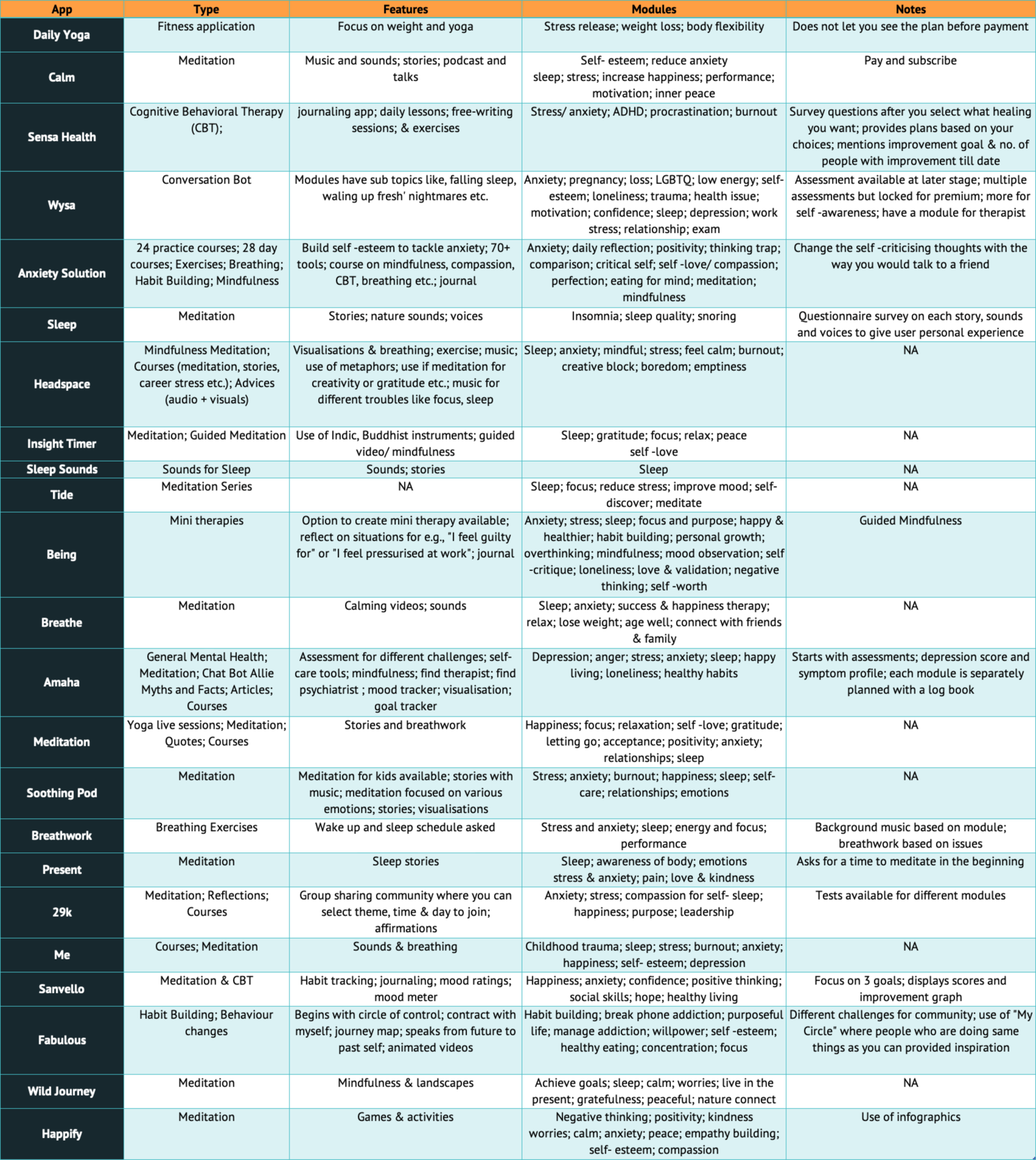 I conducted a competitive analysis of mental health apps to identify gaps and opportunities, and to spot unique value that my team could produce by designing the app for my end users. There are more than 100 mental health apps available in the market today. Therefore, I optimised the analysis by focusing on a select few apps based on keyword search: mental health apps, yoga for AID; apps using CBT; meditation for AID; and best mental health apps. I also included those apps that came up in the user interview.