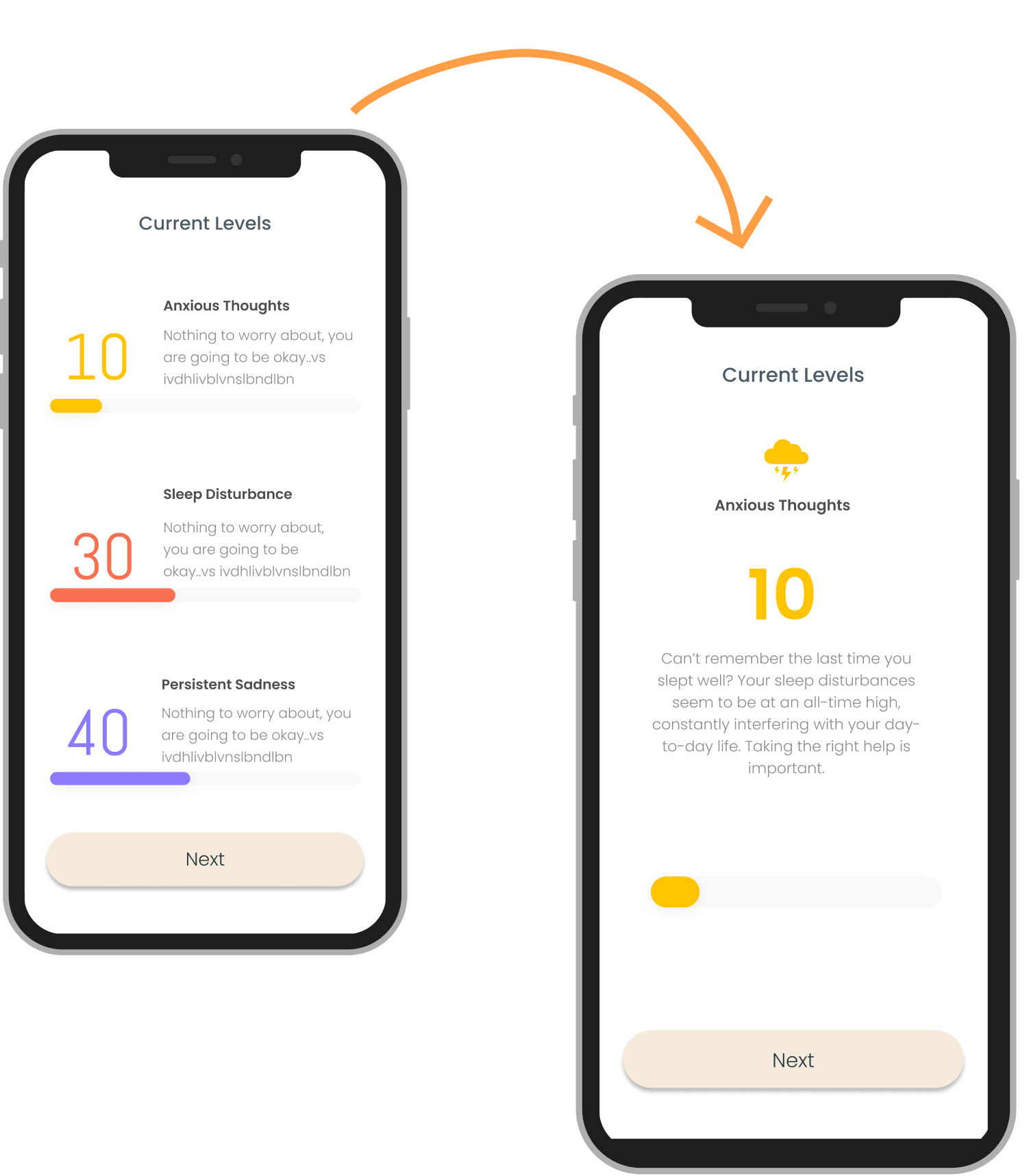 Originally, users were shown a score suggesting their anxiety, insomnia and depression level on one screen. 5 users felt it overwhelming and threatening. We redesigned the display where only one score was shown at a time. I added more white space on the screen to make it look light and less provoking.