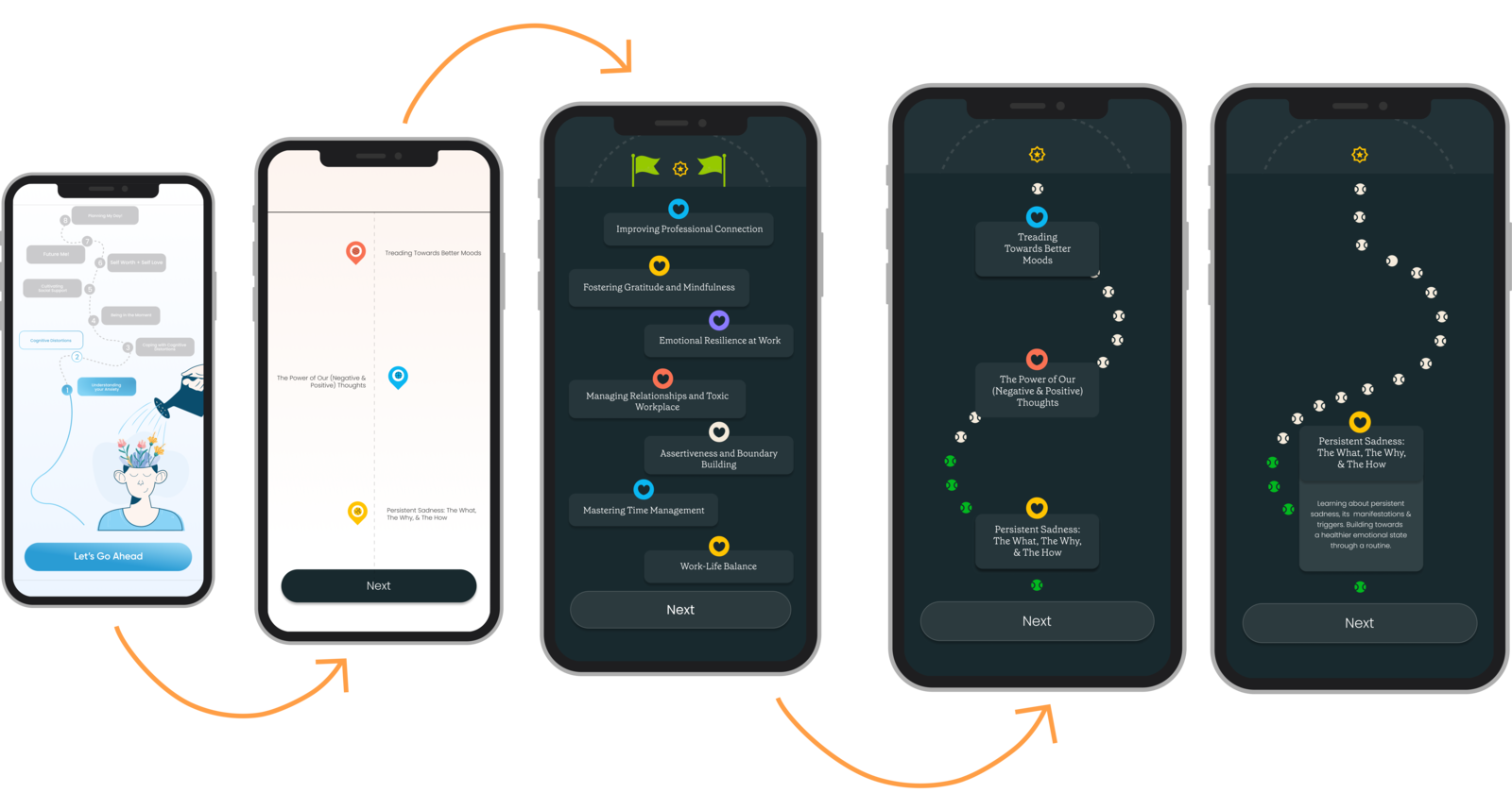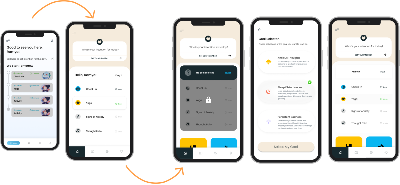 Originally the onboarding flow followed goal selection exhaustive questionnaire, which users found redundant to answer since they didn’t want to answer for other conditions if they have already selected a goal (e.g. if I have selected anxiety goal, why am I getting scores on depression or insomnia). The onboarding process was tedious and users felt bored to answer. However, after multiple discussion with the team, we retained the original onboarding questionnaire as psychologists argued users often are not aware of their condition. However, to enhance user experience, I altered the flow where goal selection was removed from onboarding. Users completed the questionnaire and received a score on AID. Later, users could take an informed decision on their goals. They could also now explore the application with several free features.