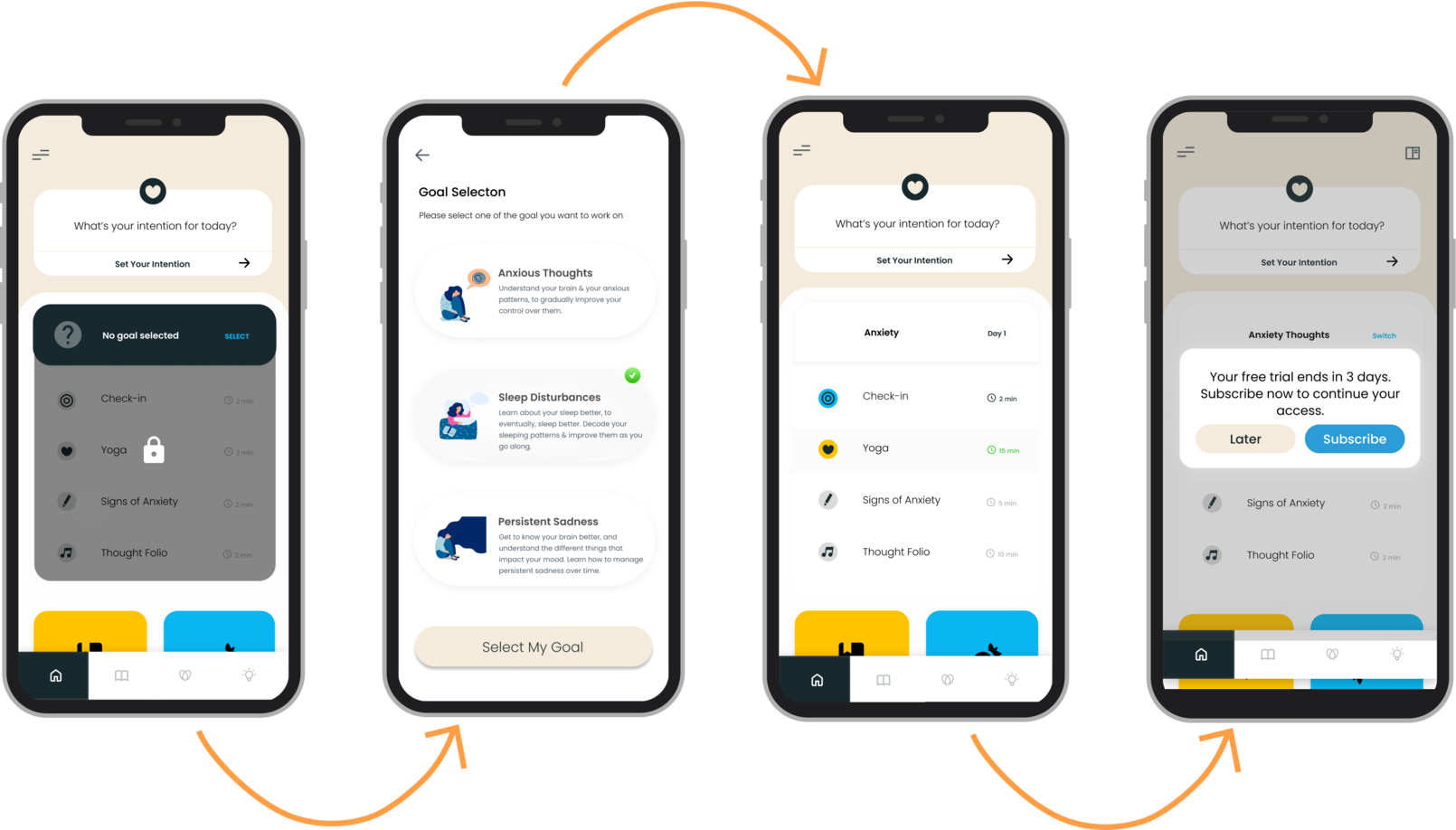 Originally, users had to purchase subscription to user any feature inside the app. However, user wanted to explore more content before purchasing the module for the goal they want to work on. After many rounds of iterations, we added a few free application features such as journal writing, daily motivation quote and mood tracking. 3 day free trial was also made available or each goal module and then subscribe to move forward.